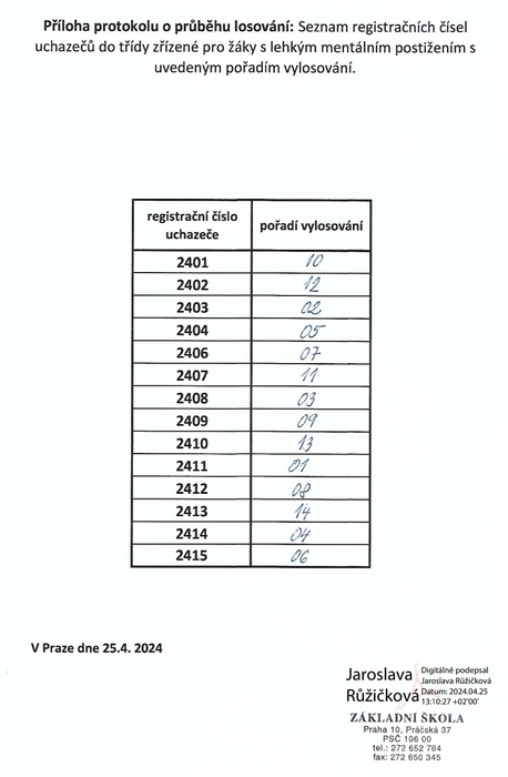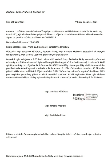 Losování uchazečů o základní vzdělávání na Základní škole, Praha 10, Práčská 37, jejichž zákonní zástupci podali žádost o přijetí k základnímu vzdělávání v řádném termínu zápisu do prvního ročníku pro školní rok 2024/2025.